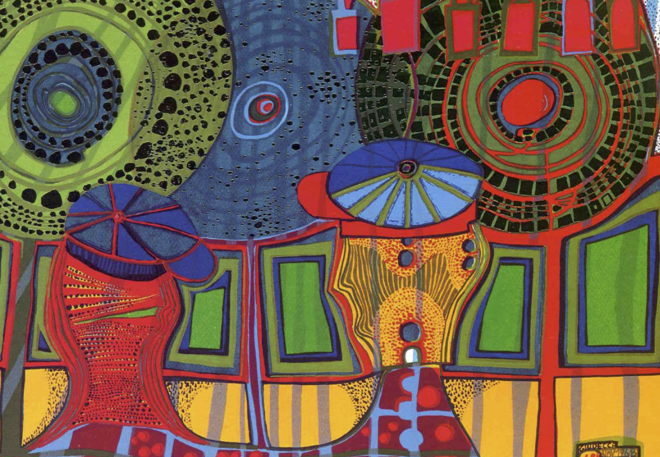 Hundertwassers werk kenmerkt zich door organische vormen en felle kleuren.